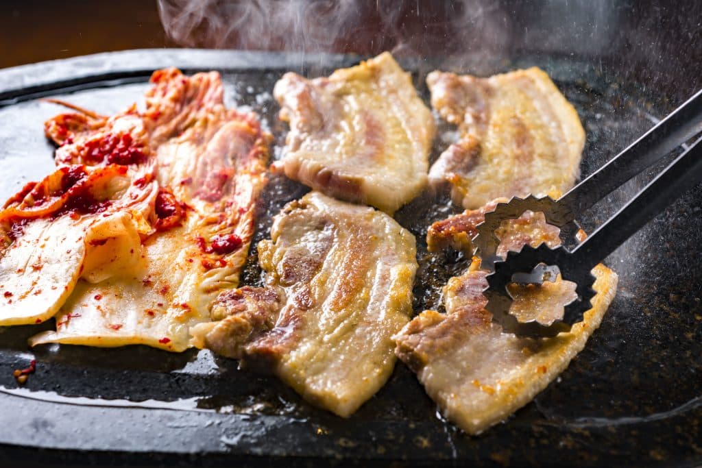 三つ目は、サムギョプサルです。サムギョプサルは、厚切りの豚バラ肉を焼いて食べる韓国の焼き肉料理です。
