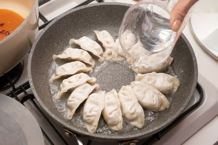 フライパンにサラダ油をひき、中火で餃子を並べます。底にうっすら焼き色がついたら、水(100ml程度)を加え、ふたをして蒸し焼きにします。