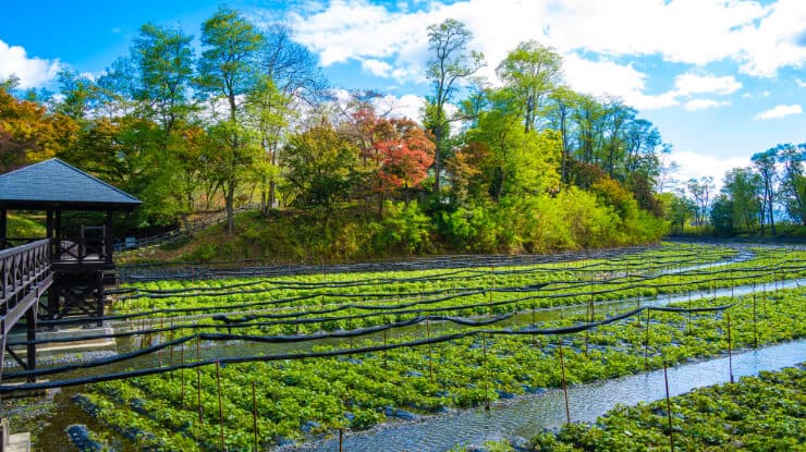 山間の清流沿いで栽培される「沢わさび」と、畑で育てる「畑わさび」があります。