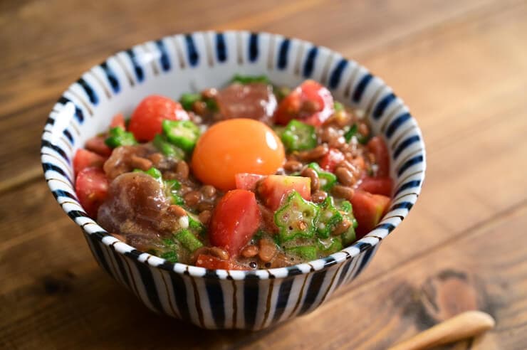 ネバネバ丼は、オクラ、納豆、とろろ、卵黄などを白ご飯の上にのせた丼です。