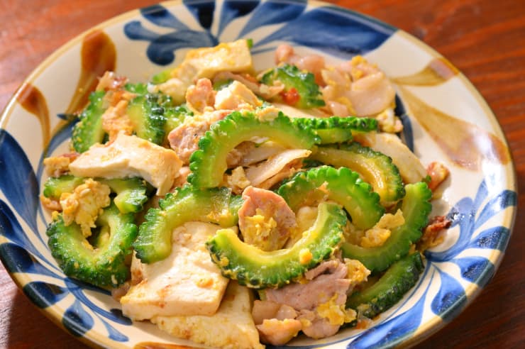 ゴーヤの苦みと豚肉のうまみ、豆腐のまろやかさが絶妙に調和し、栄養バランスもよいため、沖縄の長寿のヒケツともいわれています。
