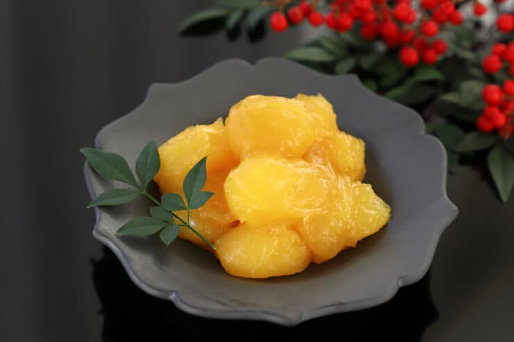 栗を砂糖で煮含めたもので、鮮やかな黄色とつややかさが特徴です。そのまま食べてもよし、ちらし寿司や栗きんとん(おせち料理)に使うなど応用範囲が広い万能な保存食です。