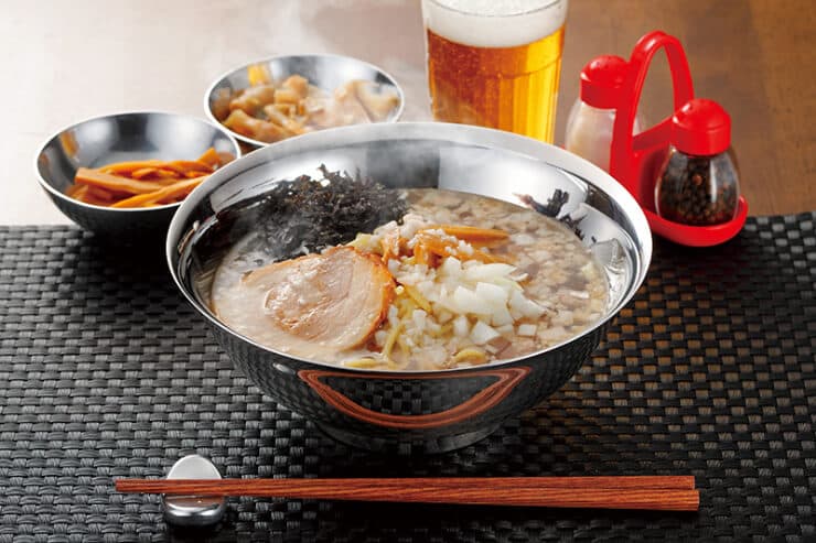 見た目は何の変哲もない丼。しかし中空構造で冷めさせません。羊の皮を被った狼ってこのことかも。メタル丼 塗装仕様 白 5,280円
