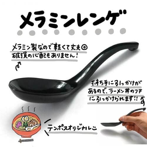 テンポスオリジナルのこのレンゲは、持ち手部分に突起が付いているので、ラーメン丼のフチに引っ掛けられるんです!