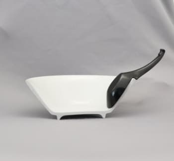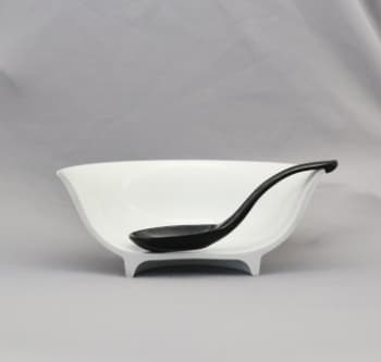 持ち手の上部に突起があり、ラーメン丼の渕に引っ掛かるため、レンゲがスープに滑り落ちるのを防ぎま す。