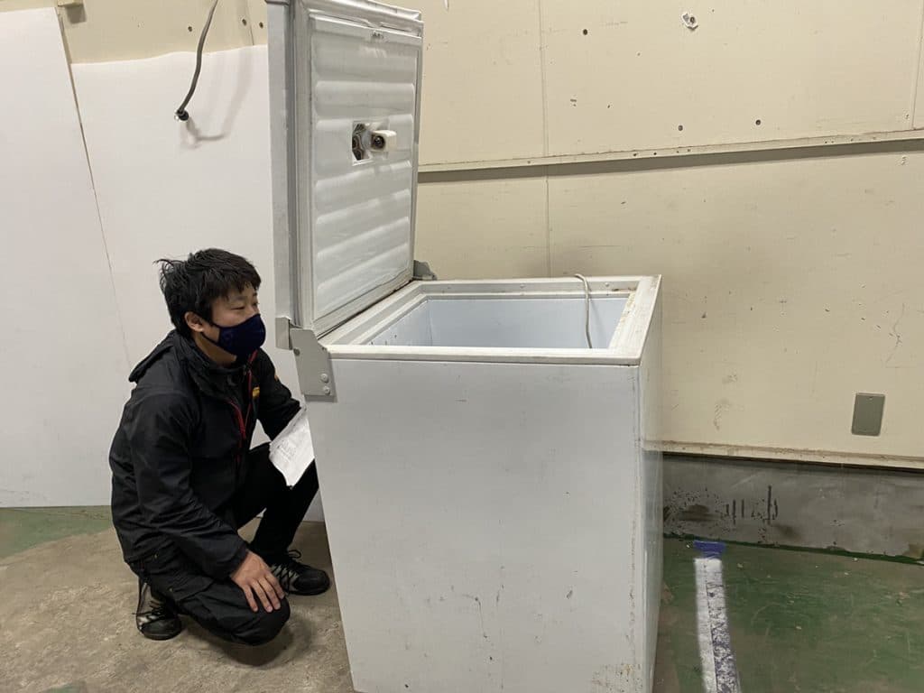 使い込まれて汚れている冷凍ストッカーも数日後にはテンポスの店頭に並ぶ立派な商品です。