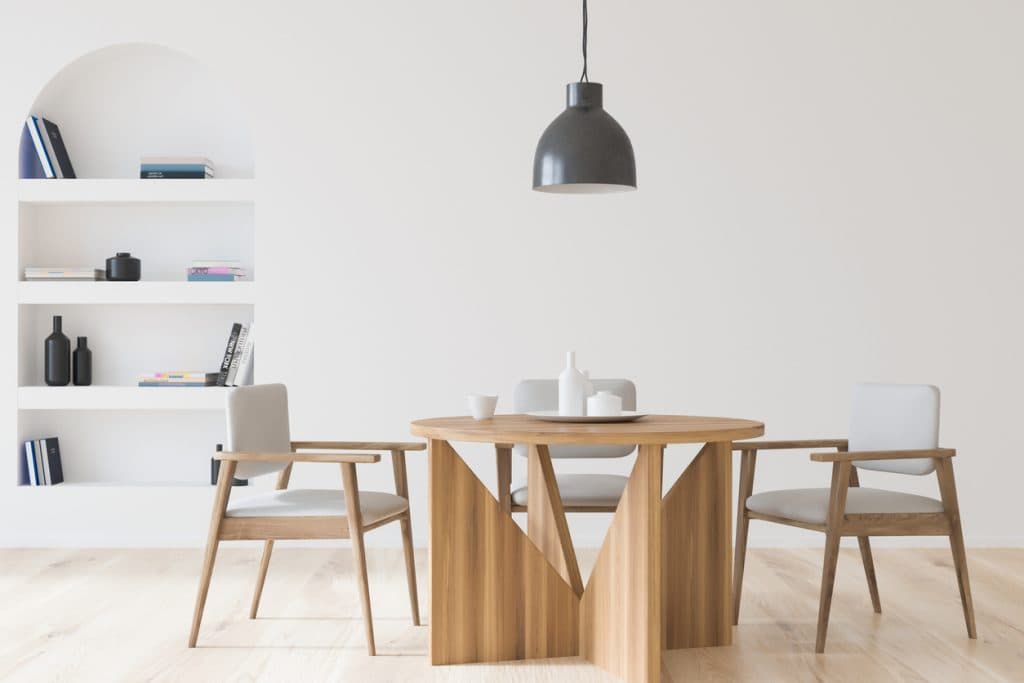 ・白い壁、木製のテーブル、革製の椅子など、シンプルで洗練されたコーディネート