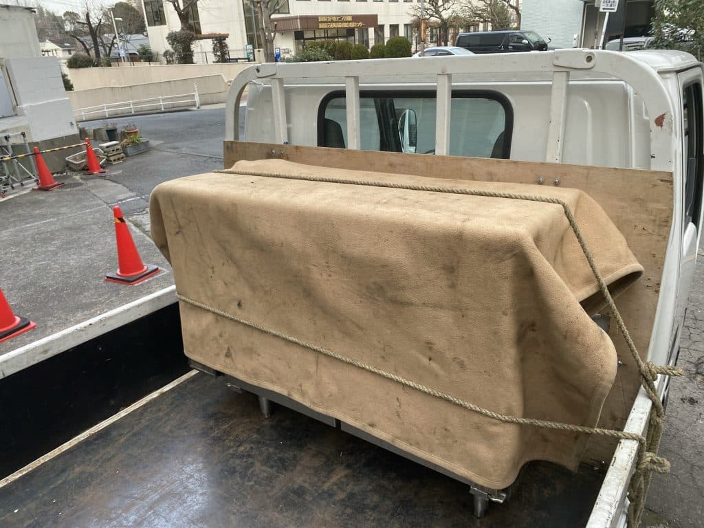 トラックに積み込んだ後は、運搬中に動いたり倒れたりしないように、しっかり固定します。