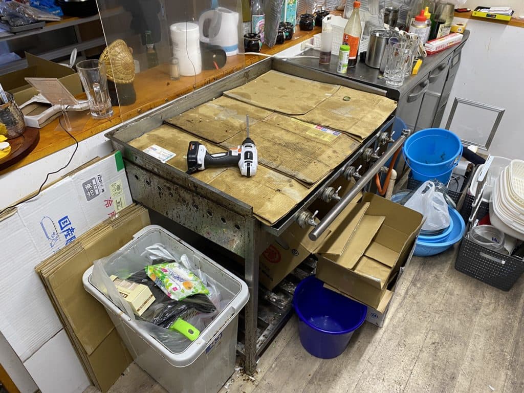 例えば、階段が狭い物件で外管式のガスグリドルを搬出する場合、鉄板やガス管の部品、油受けなど外せる部品をできる限り外し持ち出します。