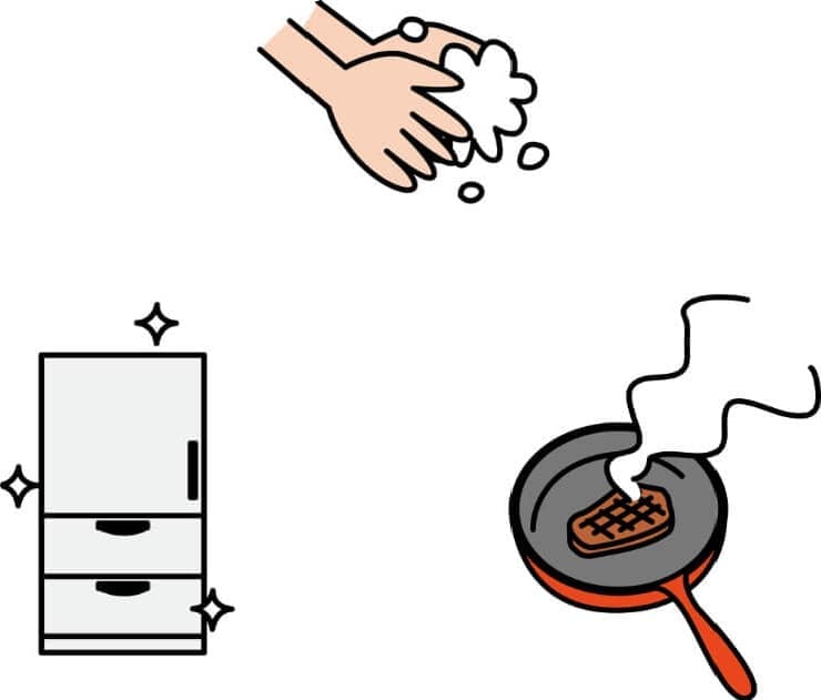 調理器具、食器、調理台などは、使用前後に十分に洗浄・消毒します。
