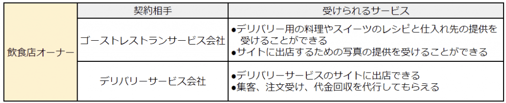 ゴーストレストランを出店する飲食店オーナーは、ゴーストレストランとデリバリーのサービス会社の両方と契約することになります。