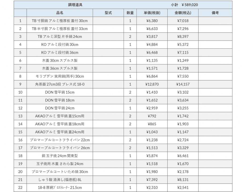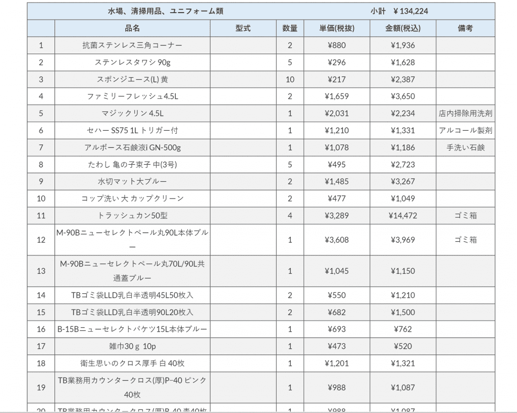 業態・席数に応じて目安の購入品をリストアップしれており、非常に便利になっております。