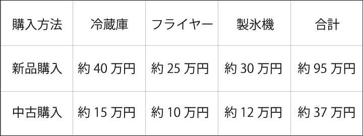 たとえば、新品で冷蔵庫・製氷機・フライヤー・ガスレンジなど一式をそろえると、100〜200万円以上かかることもありますが、中古をうまく活用すれば、その半額以下でそろえることが可能です。