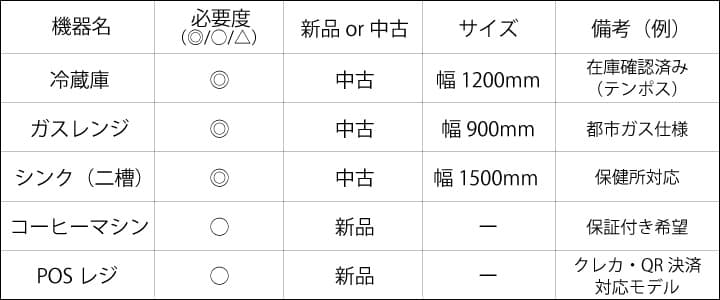 実際に開業準備を進める際は、以下のような形式で「チェックリスト」を作ると、機器の漏れや買い過ぎを防げます。