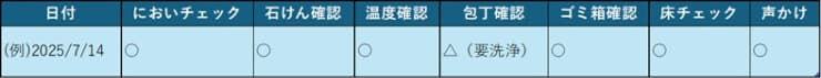 この7項目を、毎日たった5分で確認するだけで、衛生トラブルの多くを未然に防ぐことが可能です。