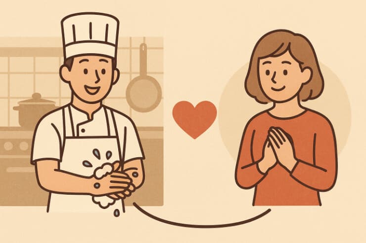 忙しい営業前や仕込み中でも、「帽子かぶってる?」「手洗いちゃんとした?」といった短い一言で、現場全体の衛生意識を引き締めることができます。