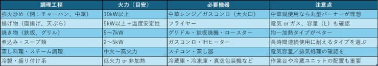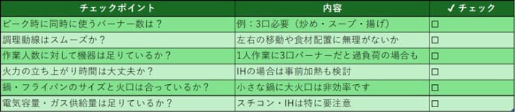 以下は、開業準備中に「どんな厨房機器・火力が必要か」をメニューや提供スタイルから逆算して整理できるチェックリストです。