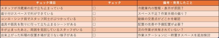 ぜひ、厨房をじっくり観察して、どこで、なぜ、誰が止まっているのかを記録してみてください。