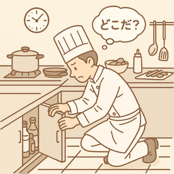 厨房の現場でスタッフが一瞬立ち止まる場面を観察してみると、その多くが「何かを探している時間」であることに気づきます。