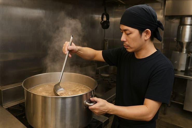 スープの工程は「強い火力で旨味を抽出」「大容量の寸胴で仕込み」「ストッカーで安定保存」「濾し器で仕上げ」といった流れで支えられています。