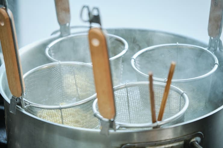 テボは麺を小分けにして茹でられるため、オーダーが重なっても個別の茹で加減に対応できます。
