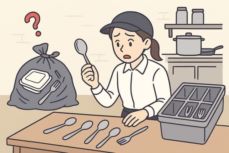 また、セルフサービス形式のお店では、お客様がトレー返却時に誤ってカトラリーを食べ残しと一緒に捨ててしまうこともあります。