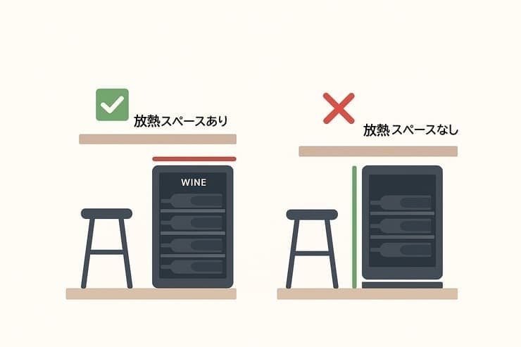 背面や側面、上部に一定のスペースを確保しないと、冷却効率が落ちて庫内温度が安定しなくなります。
