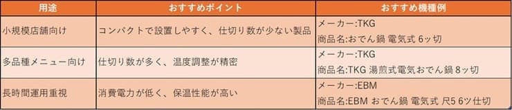 おでんを主力メニューに据える店舗や、居酒屋で多彩な具材を提供する場合は、仕切り数が多く、温度管理がしやすいモデルが最適です。