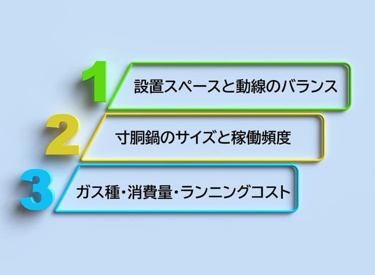 購入前に確認すべきは、設置環境・鍋サイズ・ガス条件の3点です。