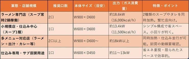 このように、スープレンジは「口数×出力×設置幅」のバランスで選ぶのが基本です。