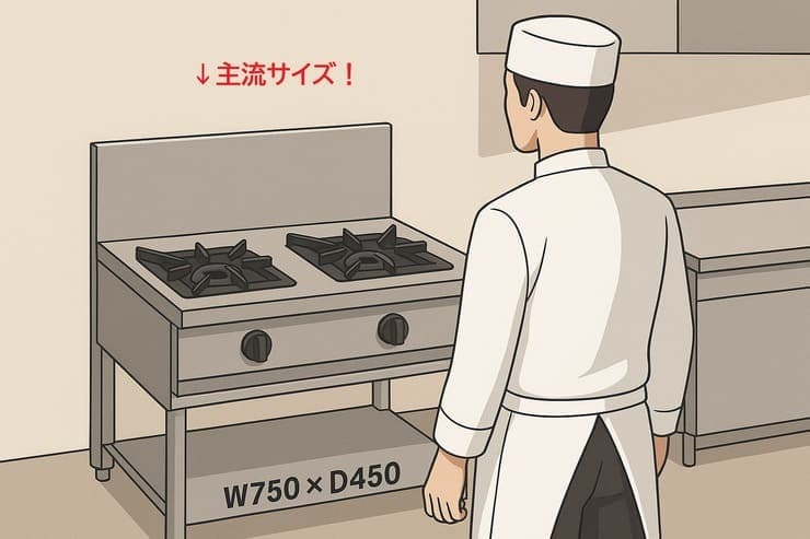 このように、「幅750×奥行450mm」前後の2口ガスレンジは、厨房設計の標準となる存在です。