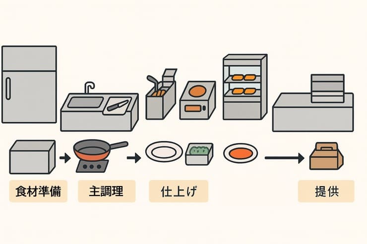 たとえば、冷蔵庫→まな板→加熱機器→仕上げ台という順番を無視して配置すると、調理ごとに行き来が発生し、1商品あたりの作業時間が数秒ずつ積み重なっていきます。