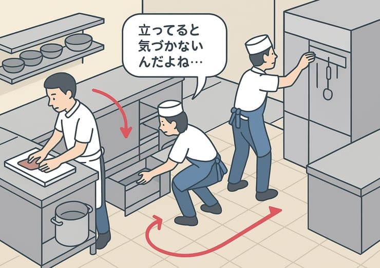とくに狭い厨房では、わずかな姿勢のズレが大きなロスとなり、開店準備やピーク時のスピードに悪影響を与えます。