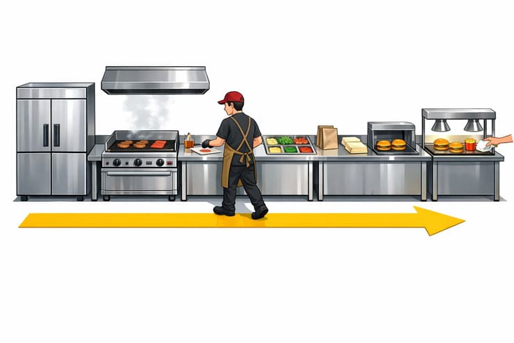 ハンバーガー店の厨房は、大きさよりも回転効率が最優先です。