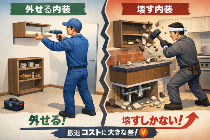 可能な限り露出配管・露出ダクトを基本とし、「外せる構造」で組むことが、原状回復費を大きく左右します。