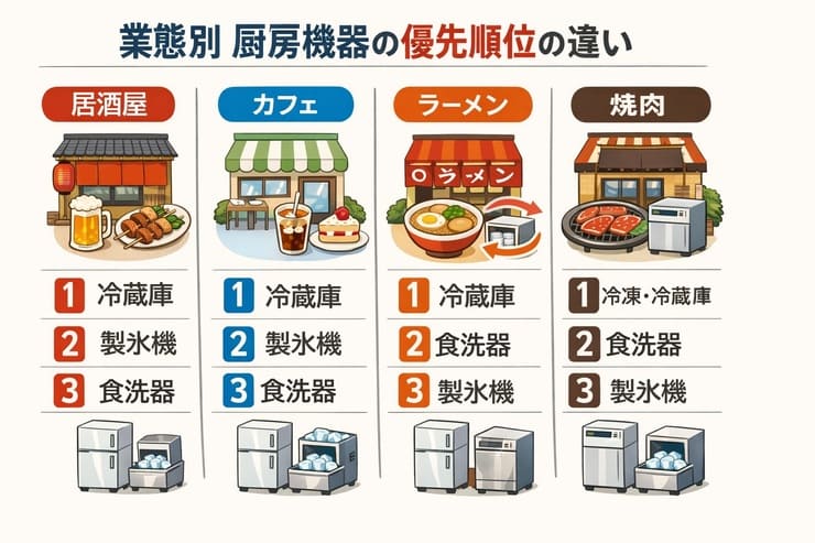 業態ごとに「売上の作り方」と「止まるポイント」が異なるため、必要な設備の順番も変わります。