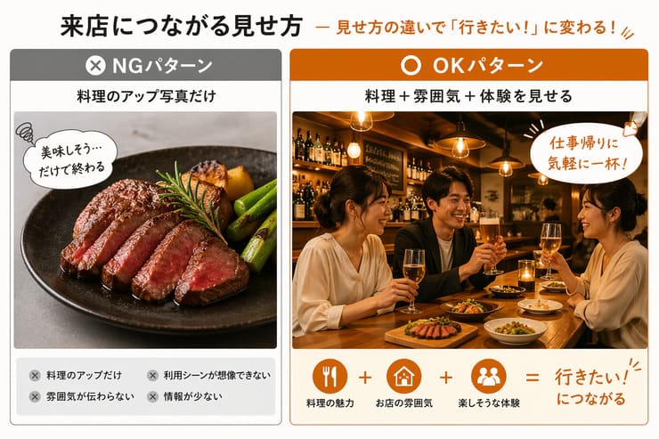 そのため、料理だけの投稿は「美味しそう」で止まり、「行きたい」にはつながりにくくなります。