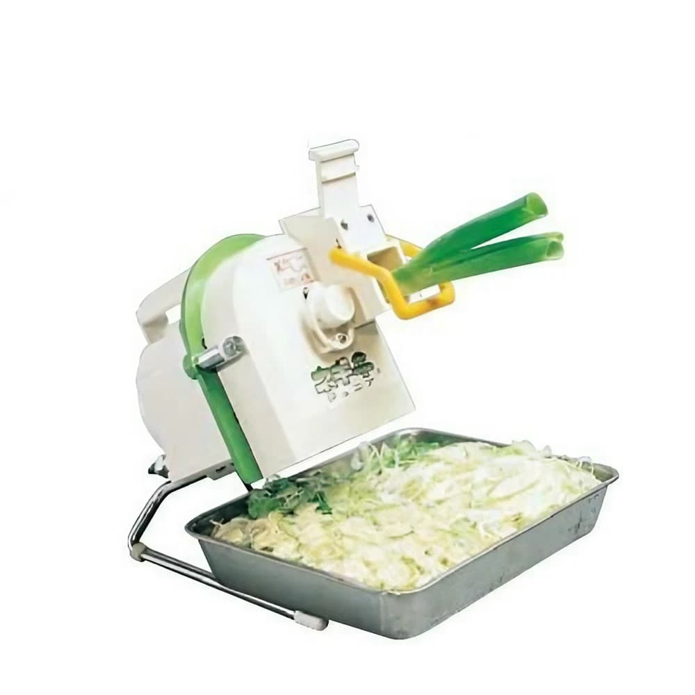 二つの投入口を使い分けることで、薬味切り、ハス切りが一台でできる、白ネギ専用の電動式ネギ切り機です。