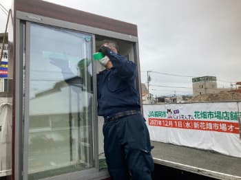 冷蔵ショーケースのガラスは運ぶ前にかならず外します。傾けるとガラス戸が一気に片側によって破損するのを防ぐためです。