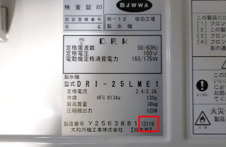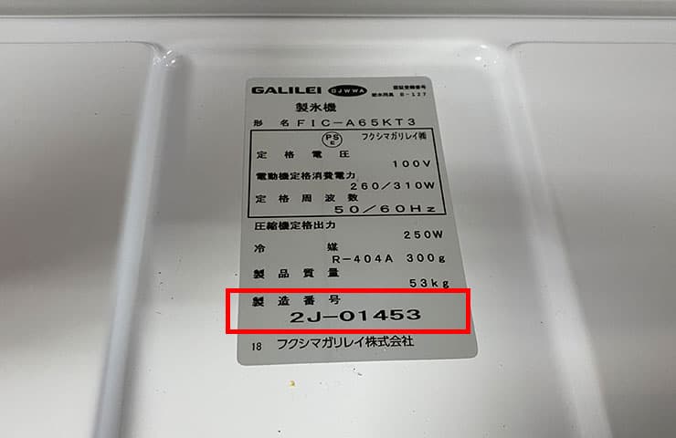 フクシマガリレイ株式会社の場合、製造番号の欄に記載されている番号の先頭の数字が製造年数を示しています。