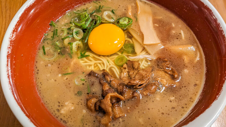「甘辛豚骨醤油+生卵」という明確な個性を持っています。ラーメンでありながら、すき焼き的な要素を感じさせる点が最大の特徴です。