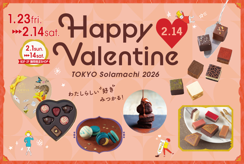 内容:ソラマチ内で展開されるバレンタイン催事。個性豊かなブランドチョコや限定スイーツが出店し、贈り物にも自分用にも楽しめるラインナップです。