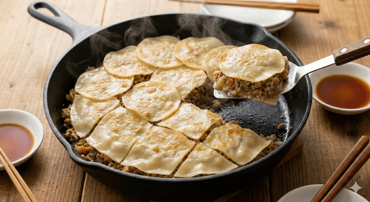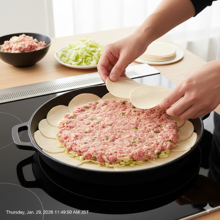 包まない餃子とは、餃子の具材と皮を個別に包まず、まとめて焼き上げる調理法です。
