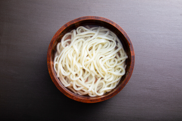 ゆでうどんは、下ゆでしてぬめりを取るのがポイントです。
