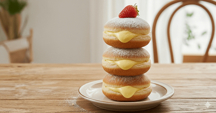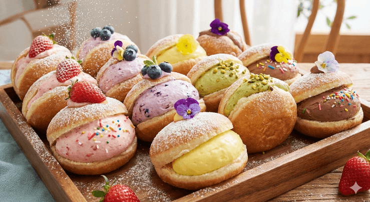 一般的なドーナツのような透けた穴がなく、中心部がクリームやフルーツなどで満たされた丸型が主流。この形と食感がSNS映えし、人気を呼びました。