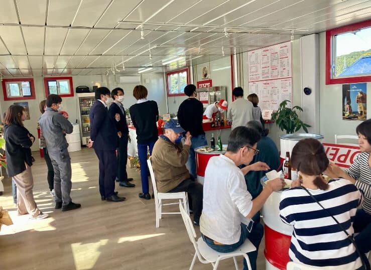 イートインスペース:イス 14脚 ドラム缶のテーブルがおしゃれ