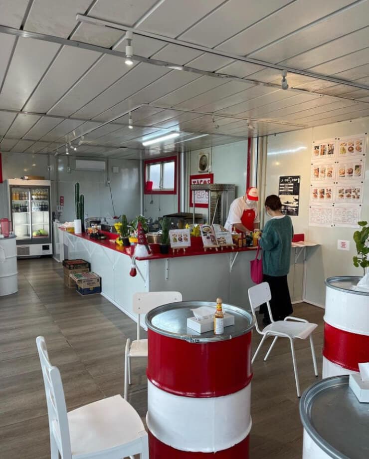 ドラム缶型のテーブルや、遠くからでも目に入りそうな真っ赤な建物に赤白の店内。