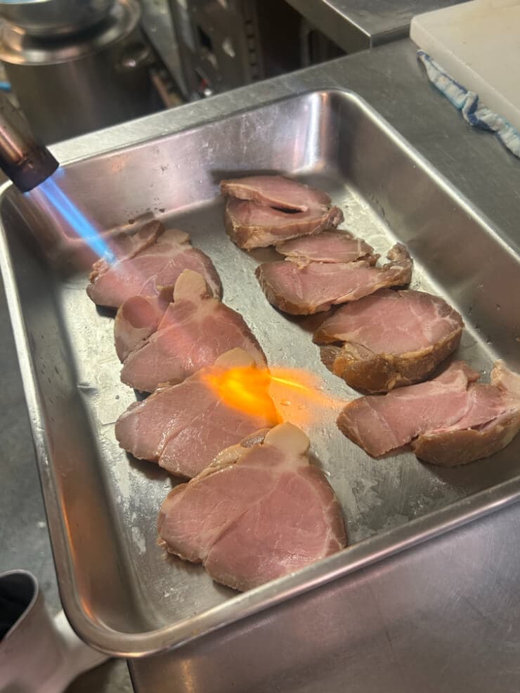 厚めに切ったチャーシューを炙って香ばしく仕上げます。