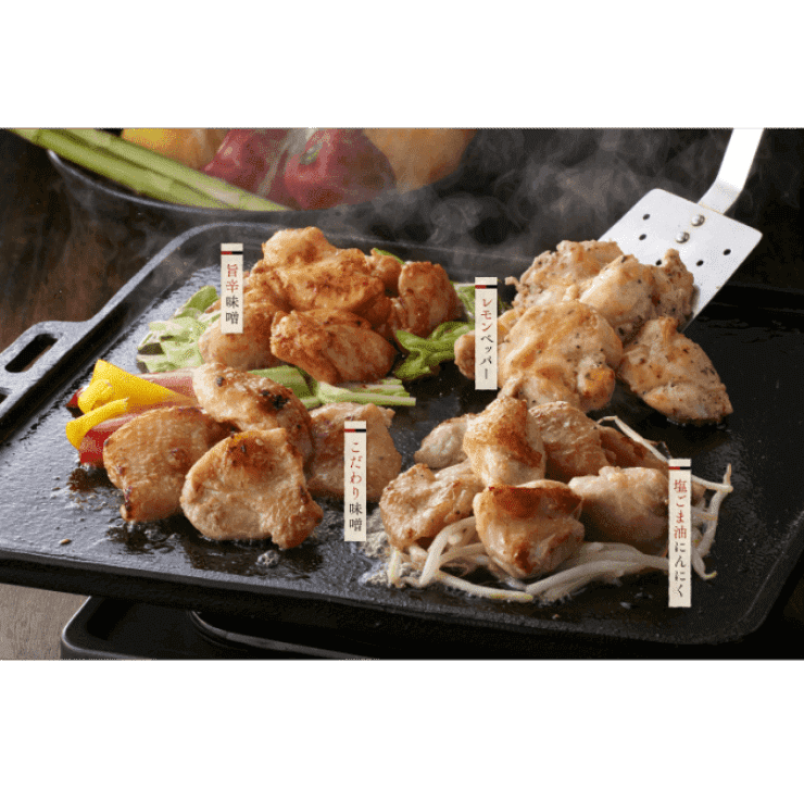 九州産銘柄鶏華味鳥の1羽から数グラムしか取れない、希少部位である“肩肉(手羽小間肉)”を使用した味付きの焼き鳥です。レモンペッパー、味噌、塩ごま油にんにく、旨辛味噌の4種類の味を楽しむことができます。