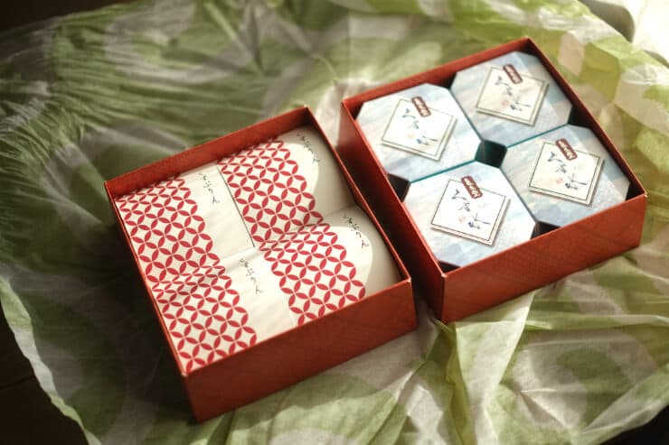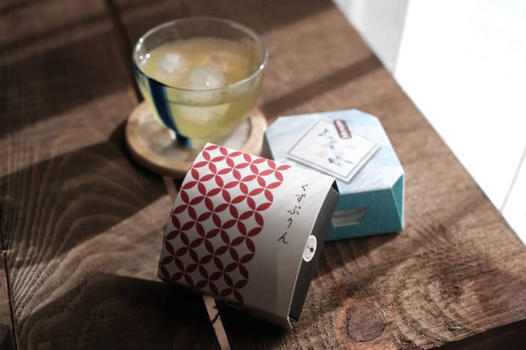 くずぷりんは、食感はくず餅、味わいは優しいプリンのような不思議な1品。さっぱりしているけれどミルクや卵の優しい風味を感じ、どこか懐かしい味わいです。包装が粋で高級感があるので、贈答用にもおすすめです。